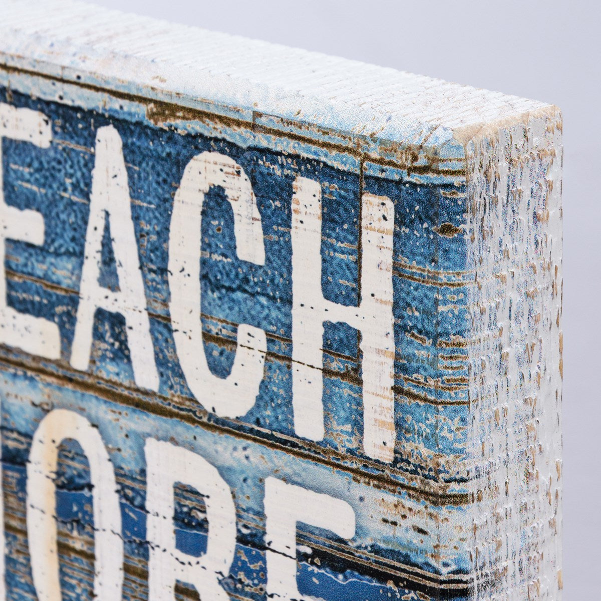 A wooden block sign features "Beach More Worry Less" sentiment in white on a beachy blue background. Distressed white sides make the design pop. Our Beach More Worry Less sign is easy to hang via predrilled keyhole slot or can free-stand alone.